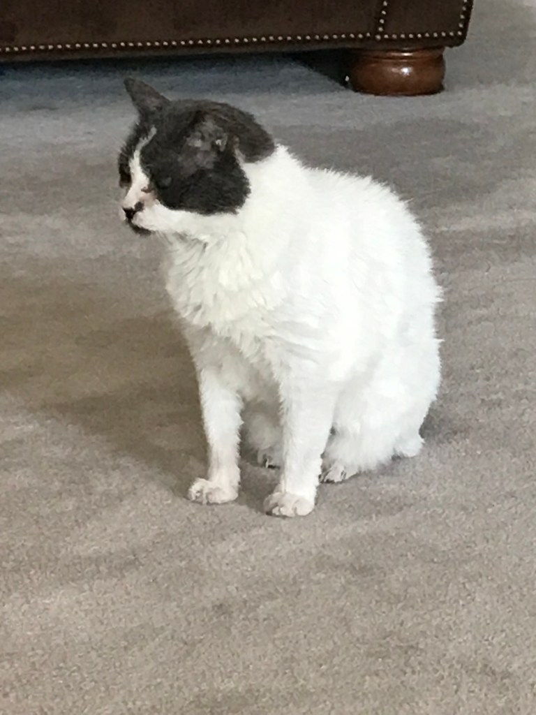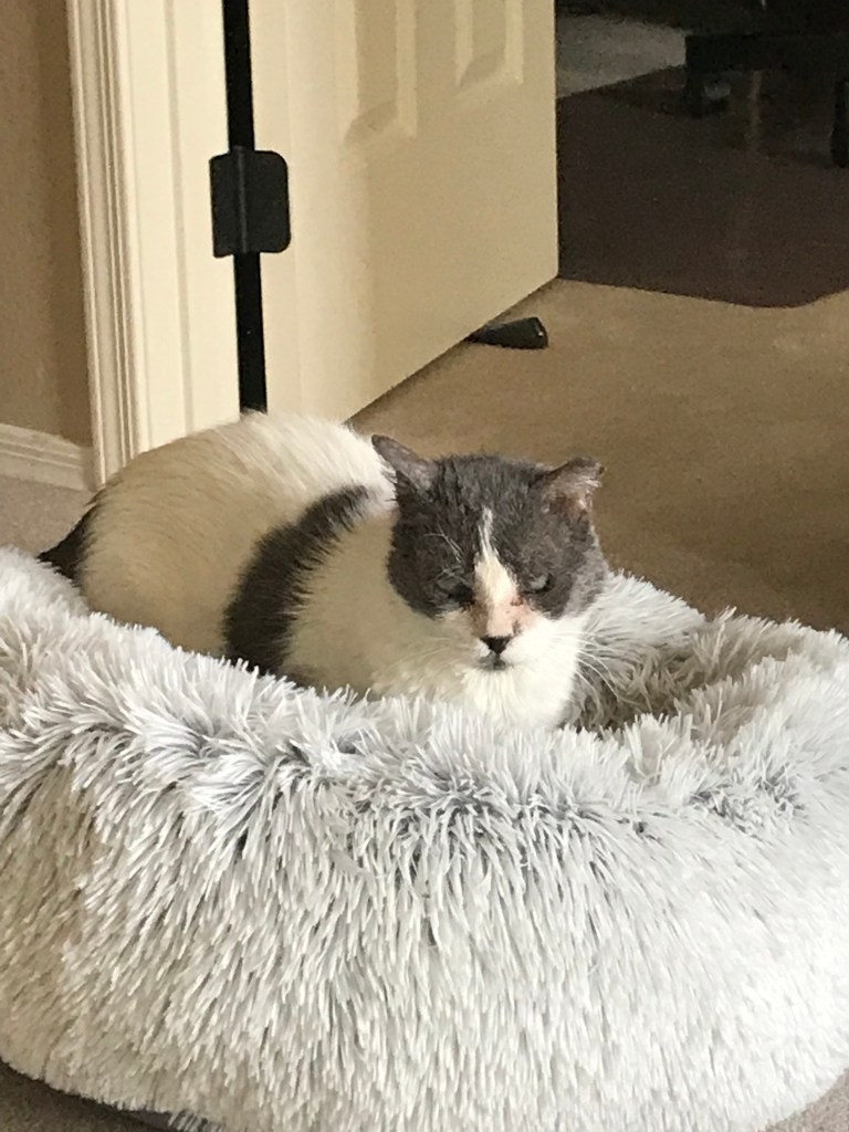 Meet Batman! Batman is a 14 year old Domestic shorthair cat who has had challenges with diabetes for a long time. When he was originally rescued by his owners, he had a reputation of being a villain; a tough guy. He was even accused by a neighbor of eating their chihuahua! After he was neutered, he stayed closer to home, although he still fought off advances from neighborhood cats, and even an owl!. As he got older, he developed diabetes, and problems with his vision secondary to the diabetes, and now lives the comfortable life of an indoor cat, getting cuddles and love.